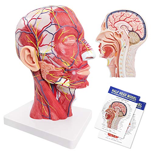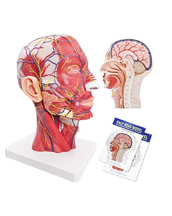 Modelo de Anatomía Humana de la mitad de la cabeza (lado derecho). Oreja desmontable. Incluye hoja guía y base . Sección sagital de modelo de cabeza y cuello donde se observan las estructuras musculares, vasculares y superficiales. Escala 1:1 (lado derecho). Acabado fino. Ofrece una gama completa de características anatómicas. Muestra los músculos superficiales de la cara expuesta; los vasos sanguíneos superficiales y los nervios de la cara y el cuero cabelludo; las estructuras internas de la glándula parótida y el tracto respiratorio superior; la estructura transversal sagital de la columna cervical